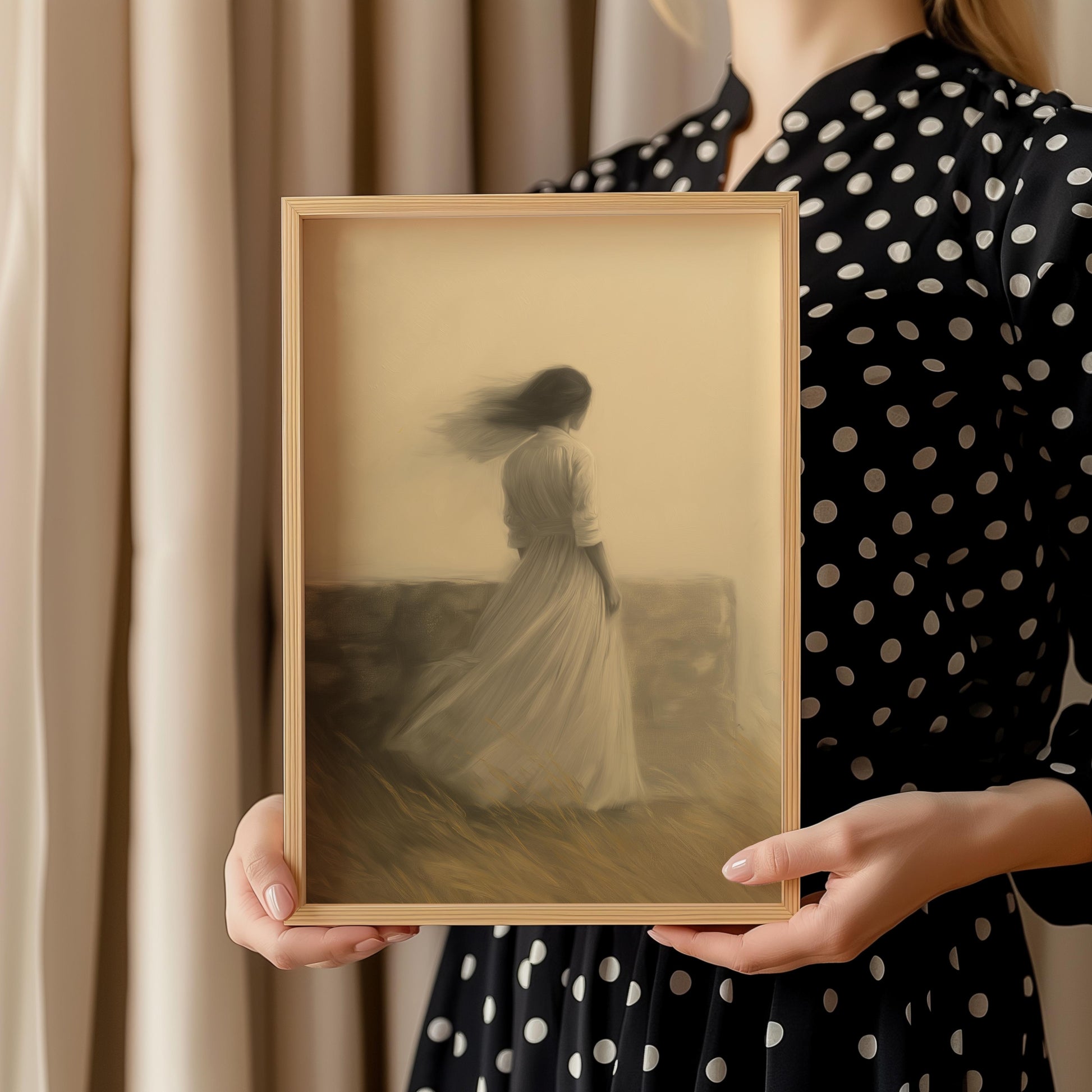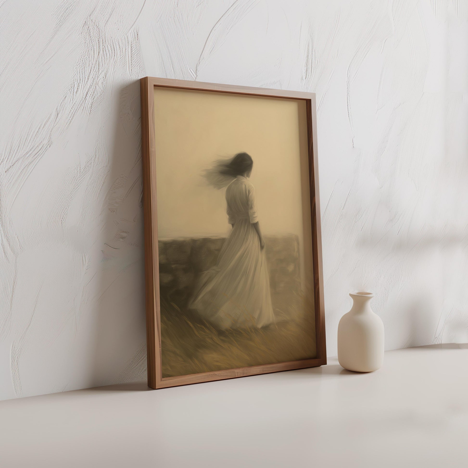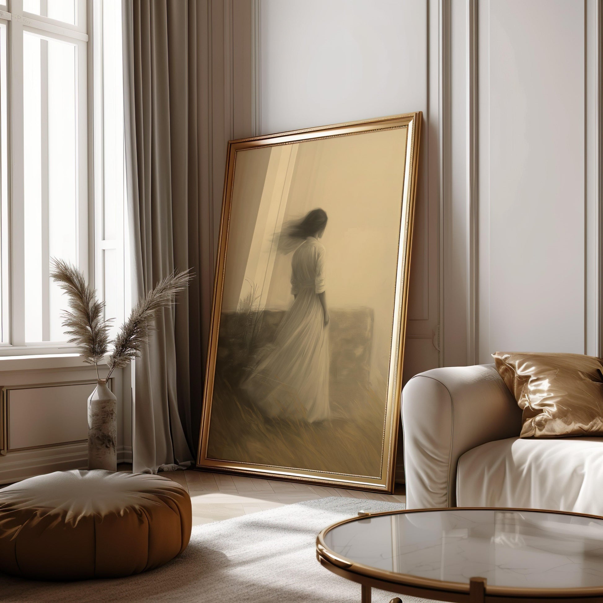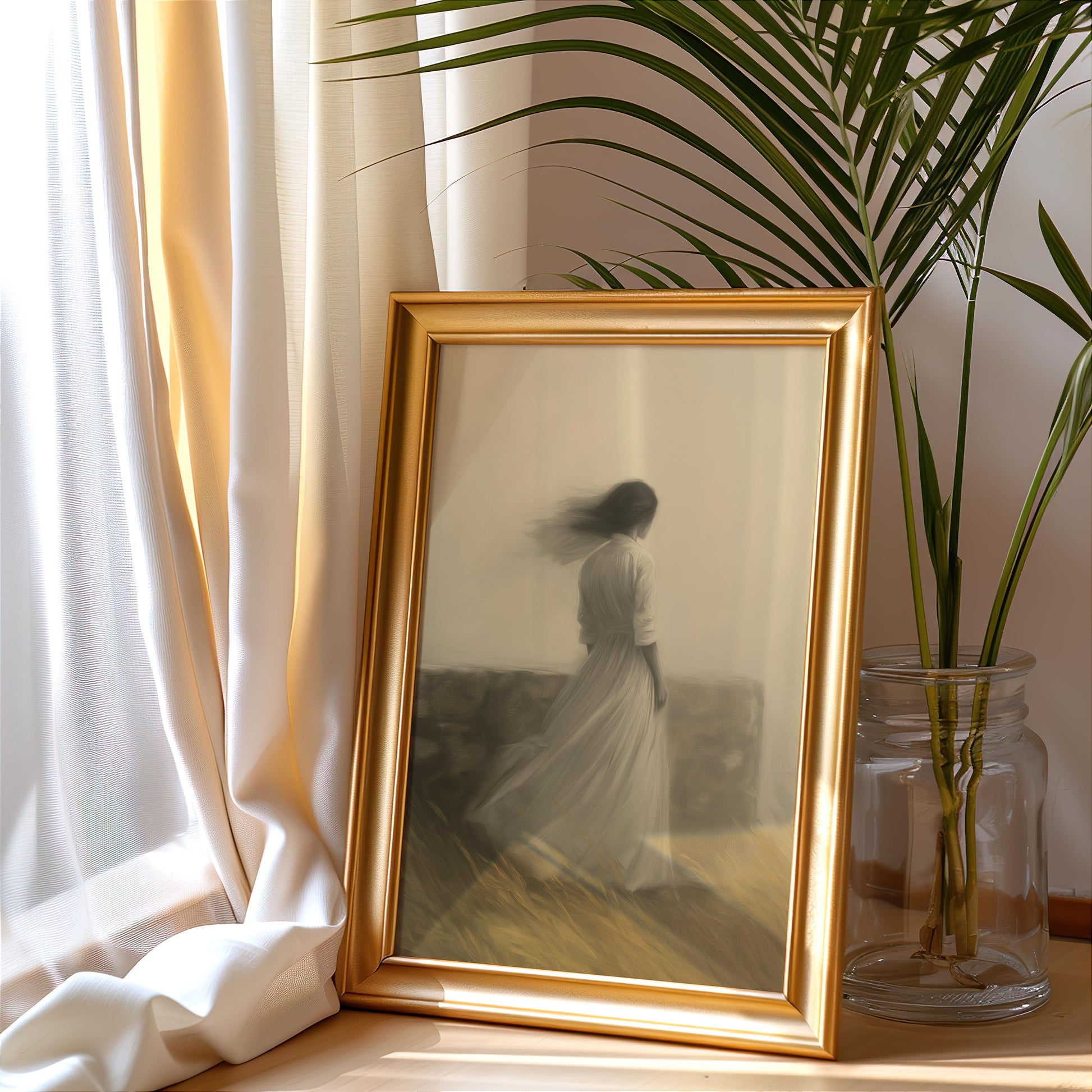 This ethereal painting captures the quiet grace of a woman in motion, adding timeless elegance to any space.