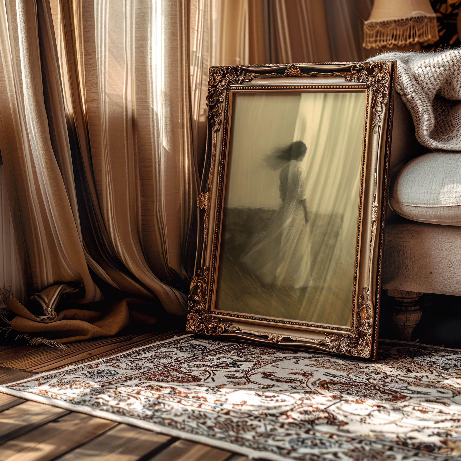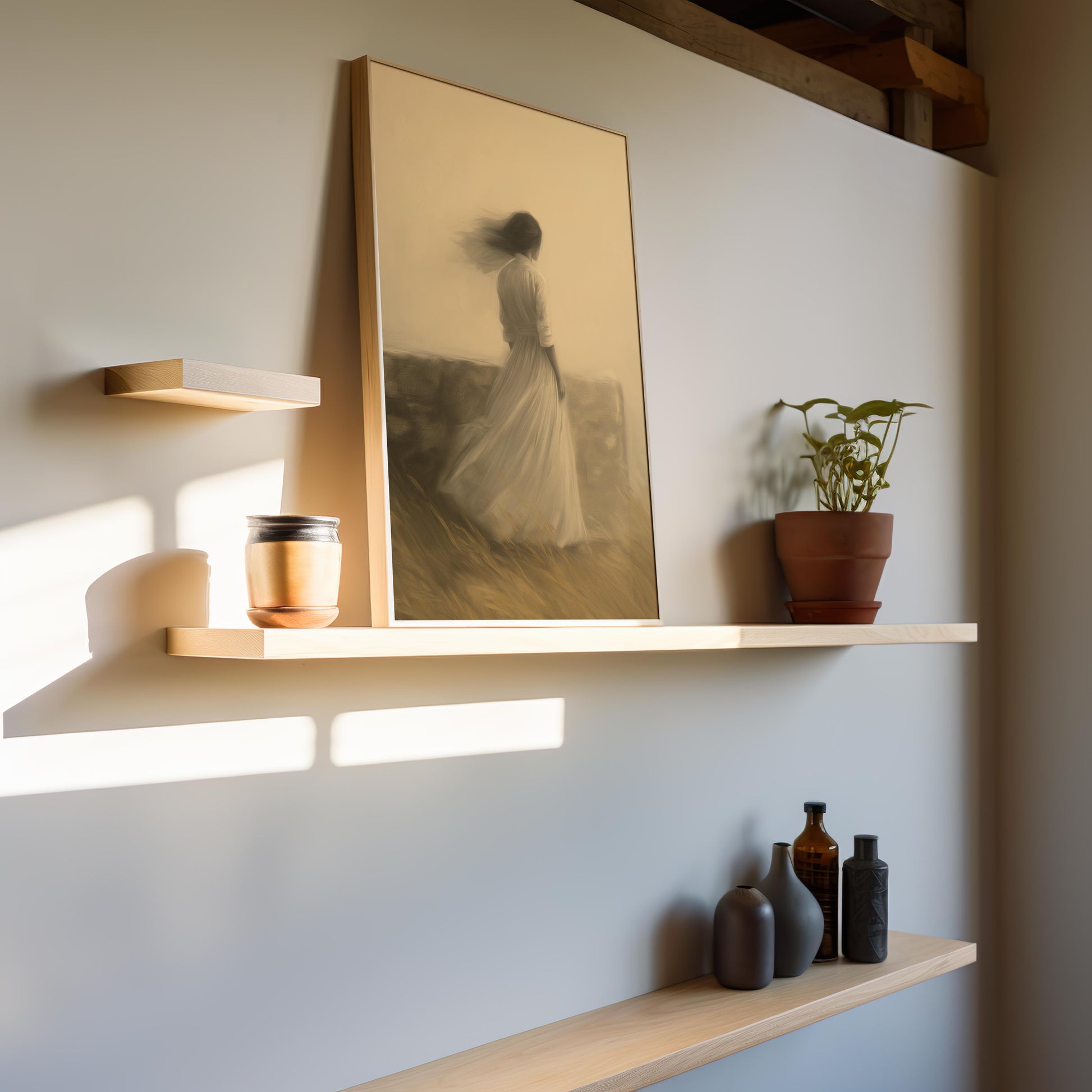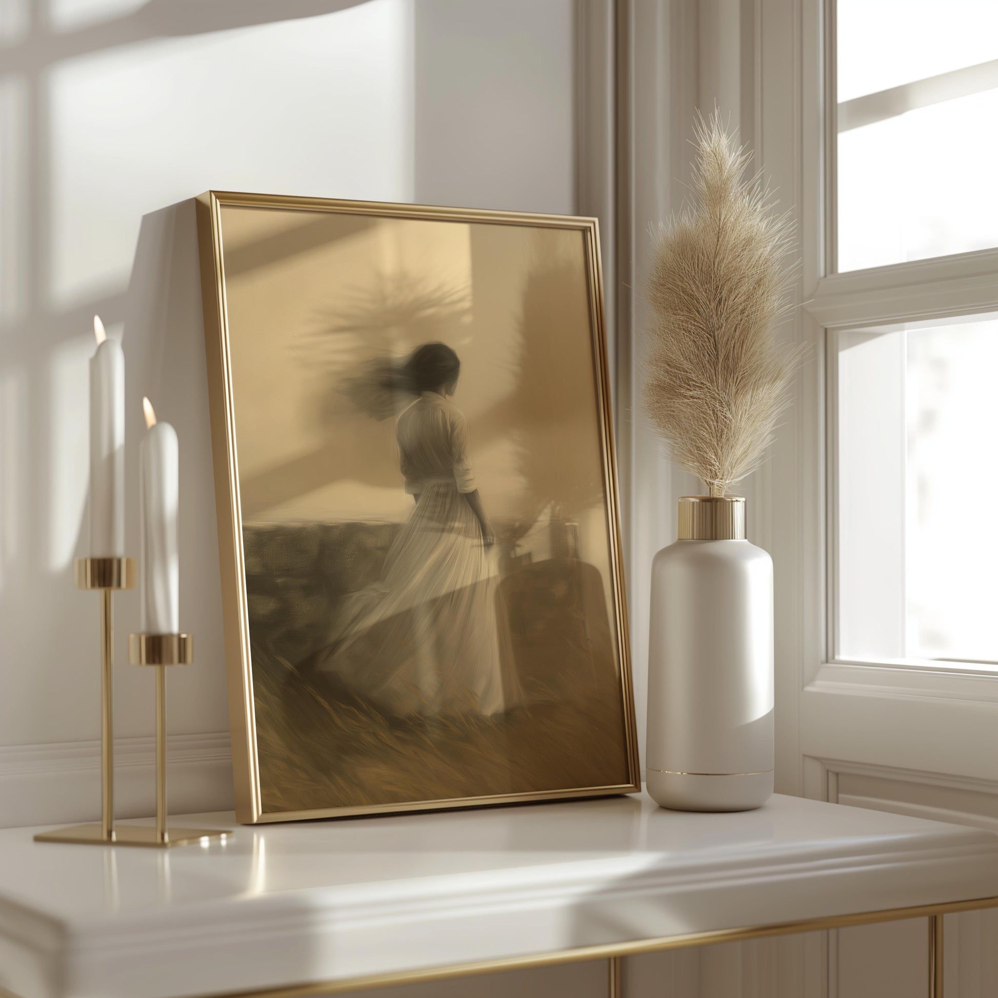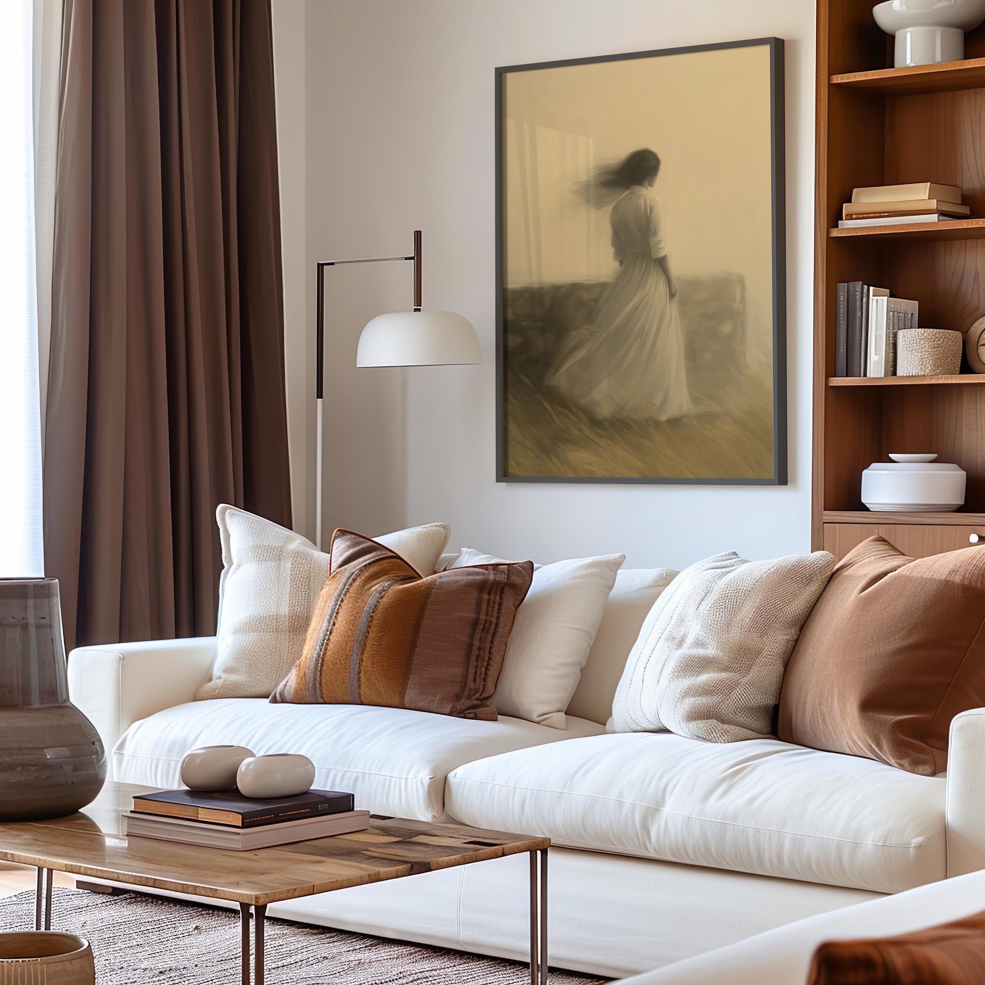 This ethereal painting captures the quiet grace of a woman in motion, adding timeless elegance to any space.