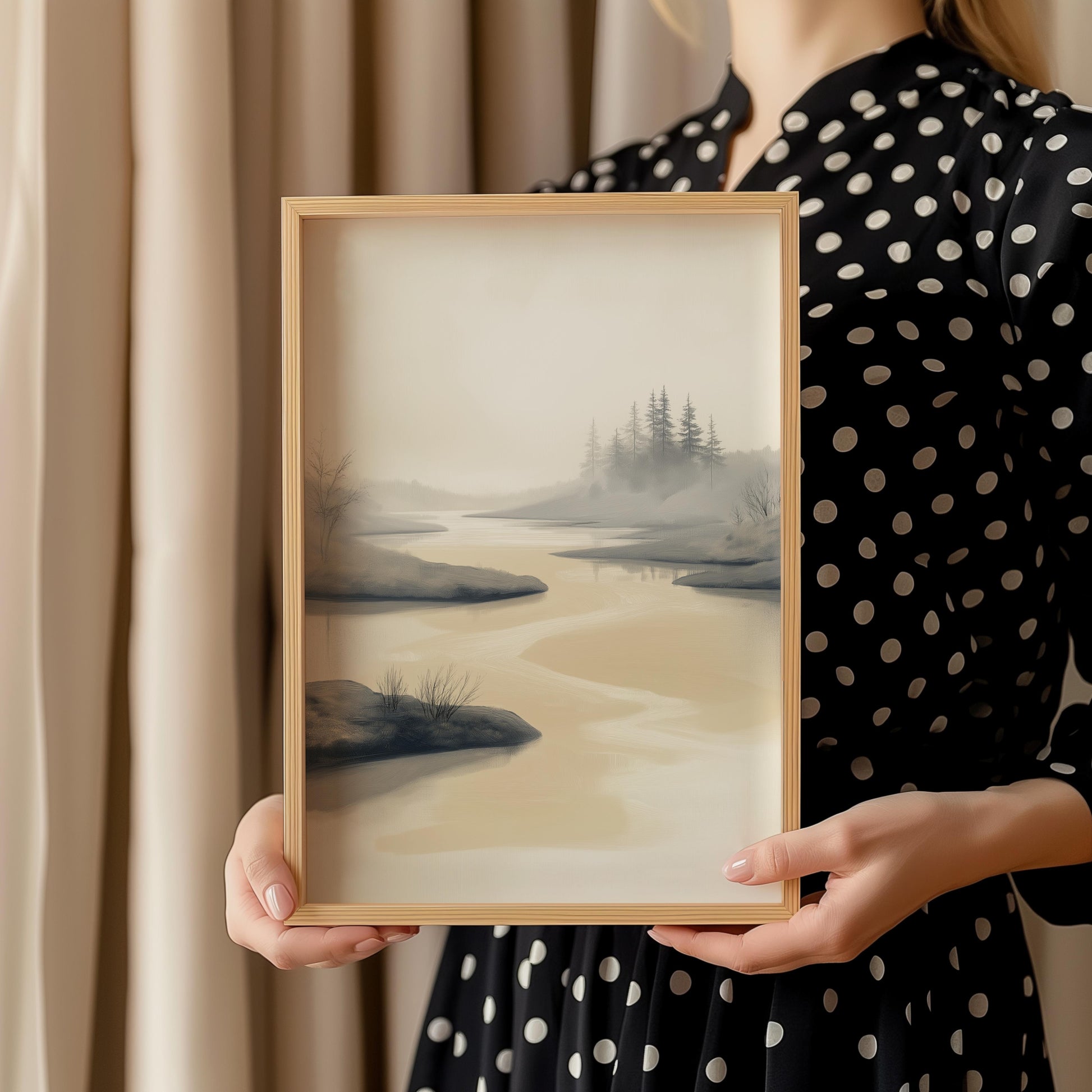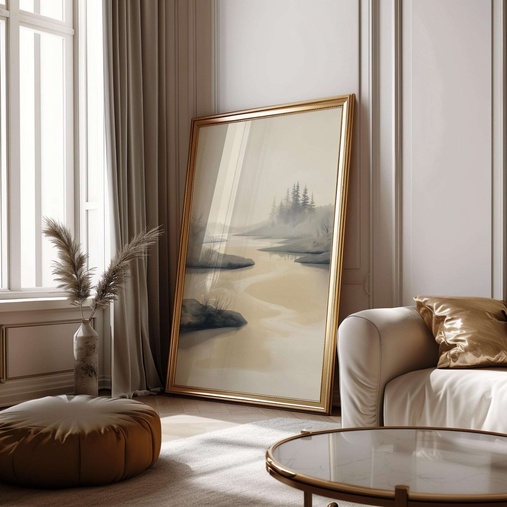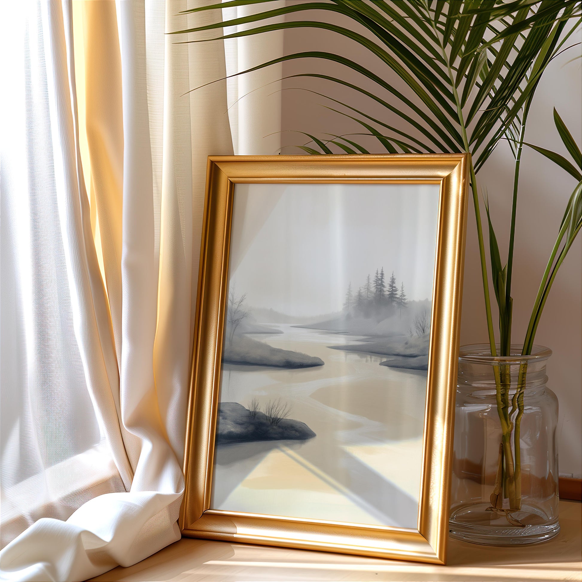 Bring the beauty of nature indoors with this dreamy misty forest and river poster, perfect for adding a serene touch to your space.