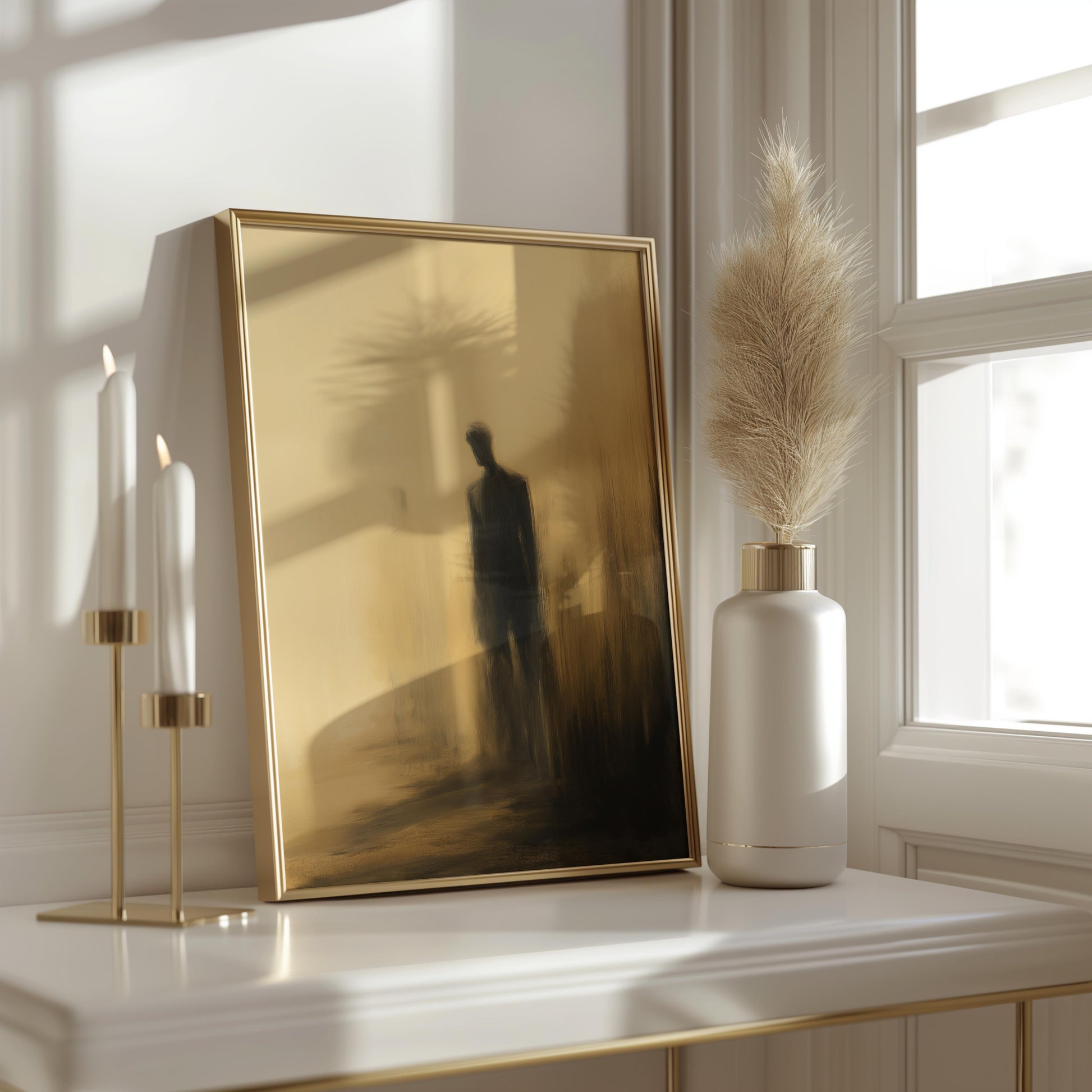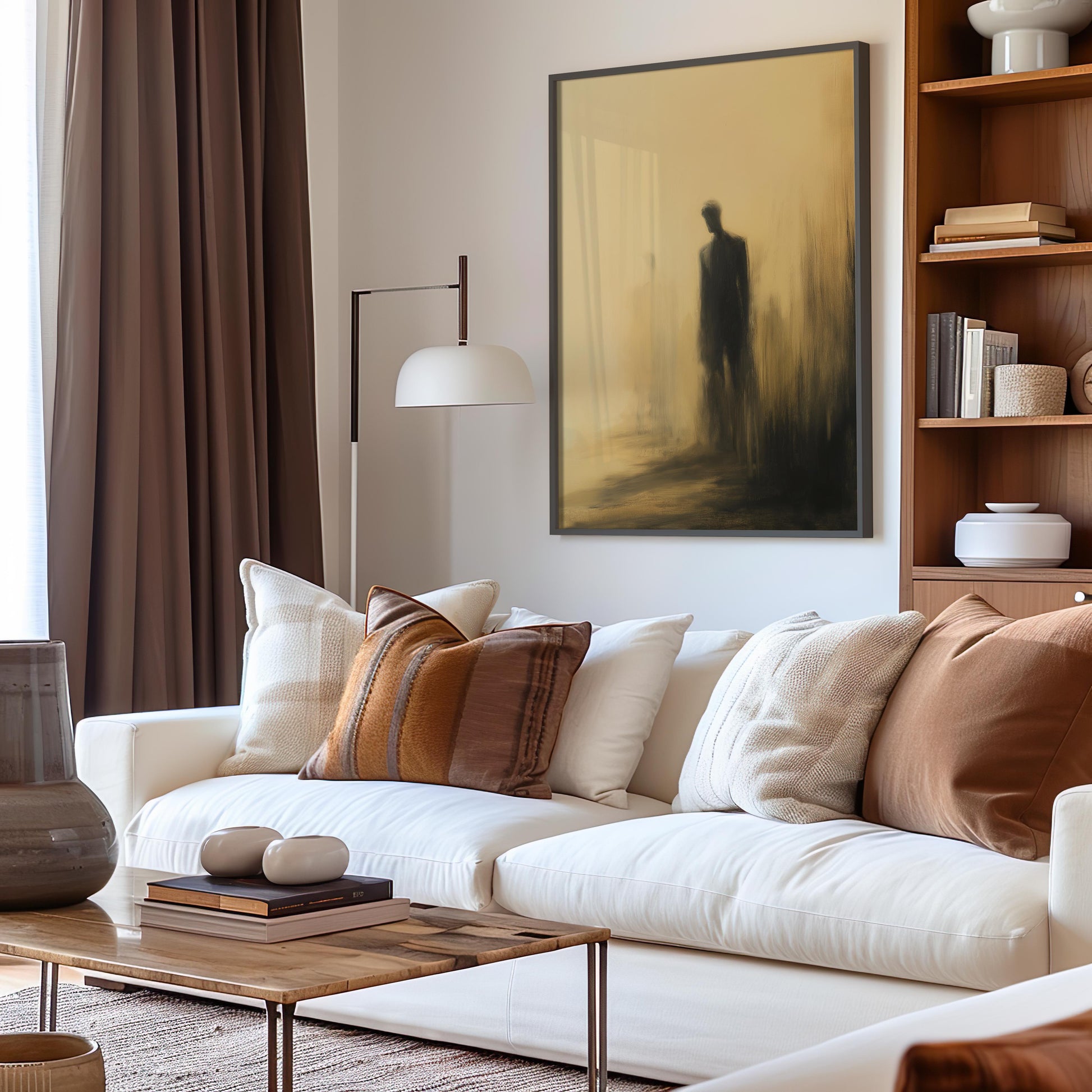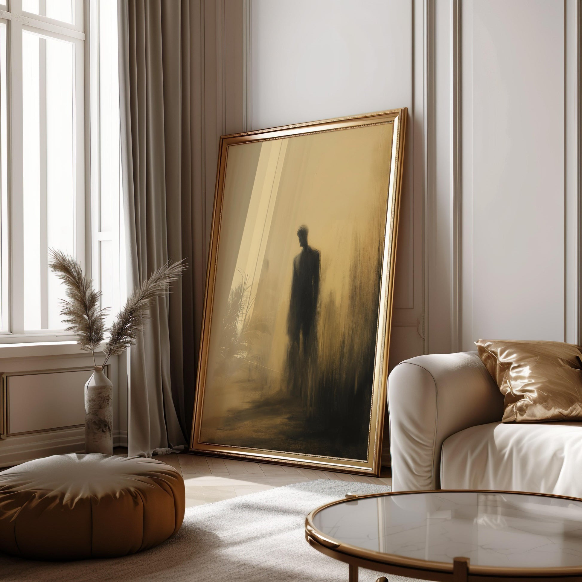 This abstract silhouette artwork features warm golden hues and a minimalist bohemian design, perfect for adding depth and elegance to any modern space.