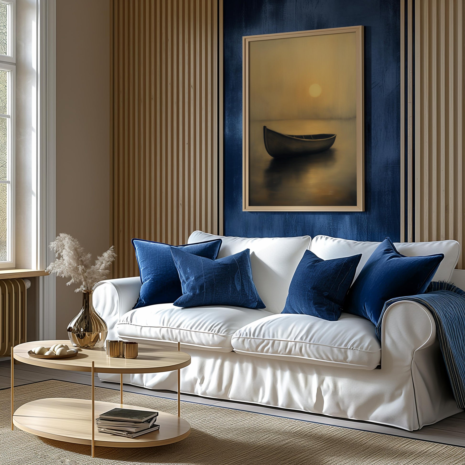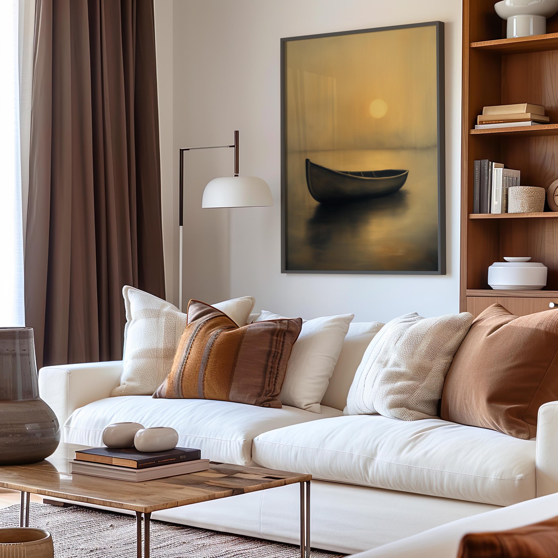 This serene depiction of a canoe at sunset brings warmth and tranquility to your modern living space.