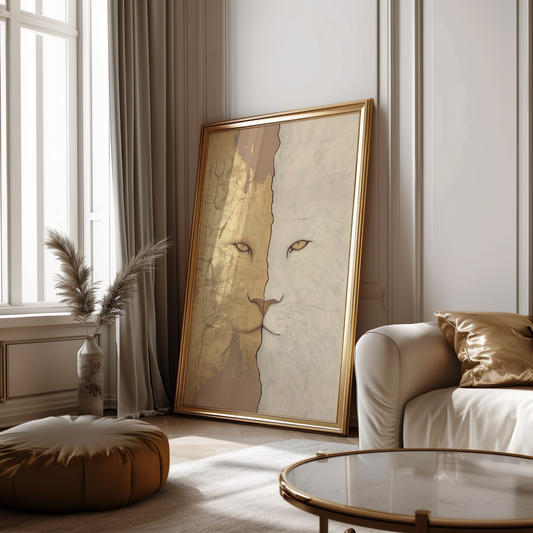 Split Lion Face Poster – Abstract Wildlife Art in Golden Tones