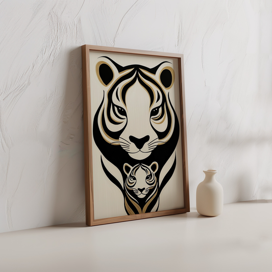 Minimalist Tiger Poster – Bold Black and Gold Animal Art, Creamy Background - Digital Print