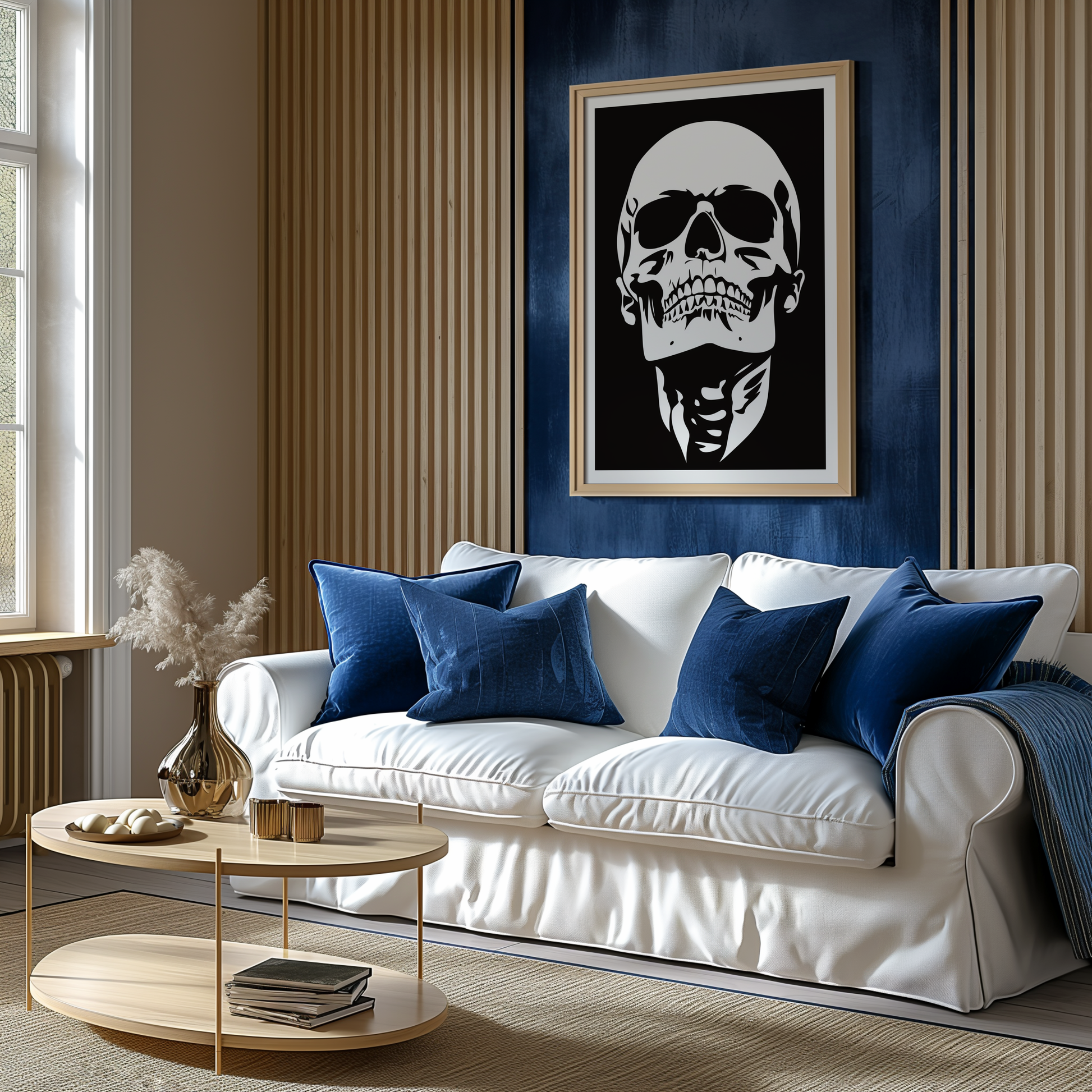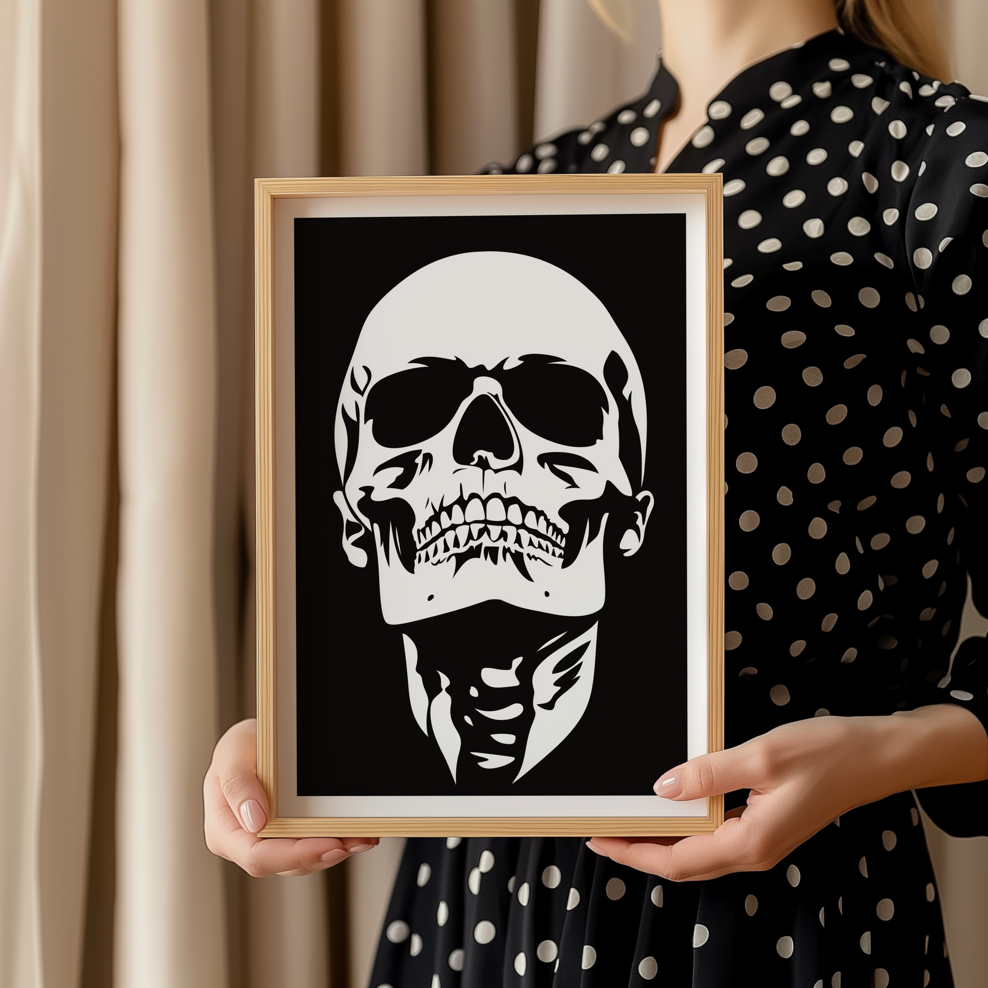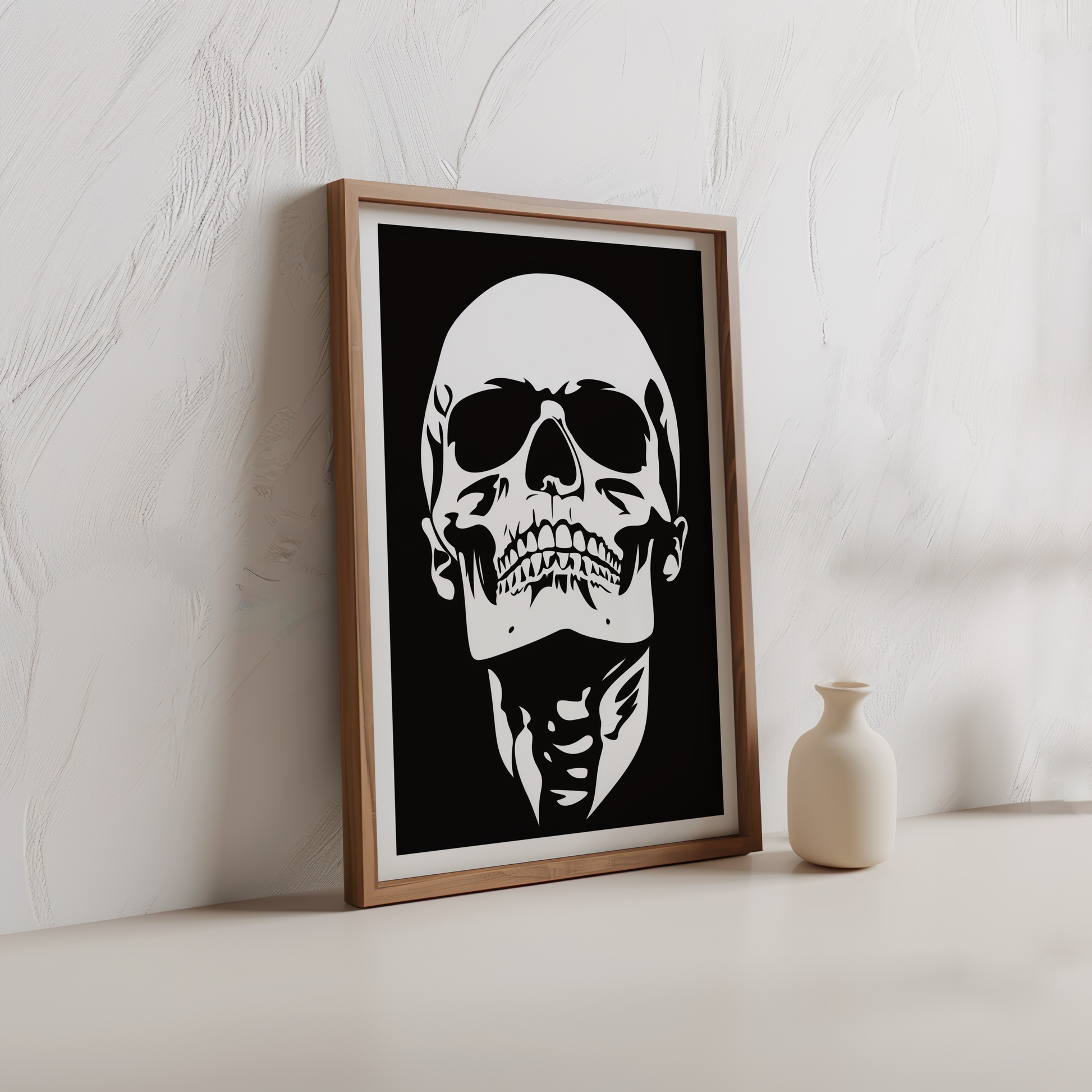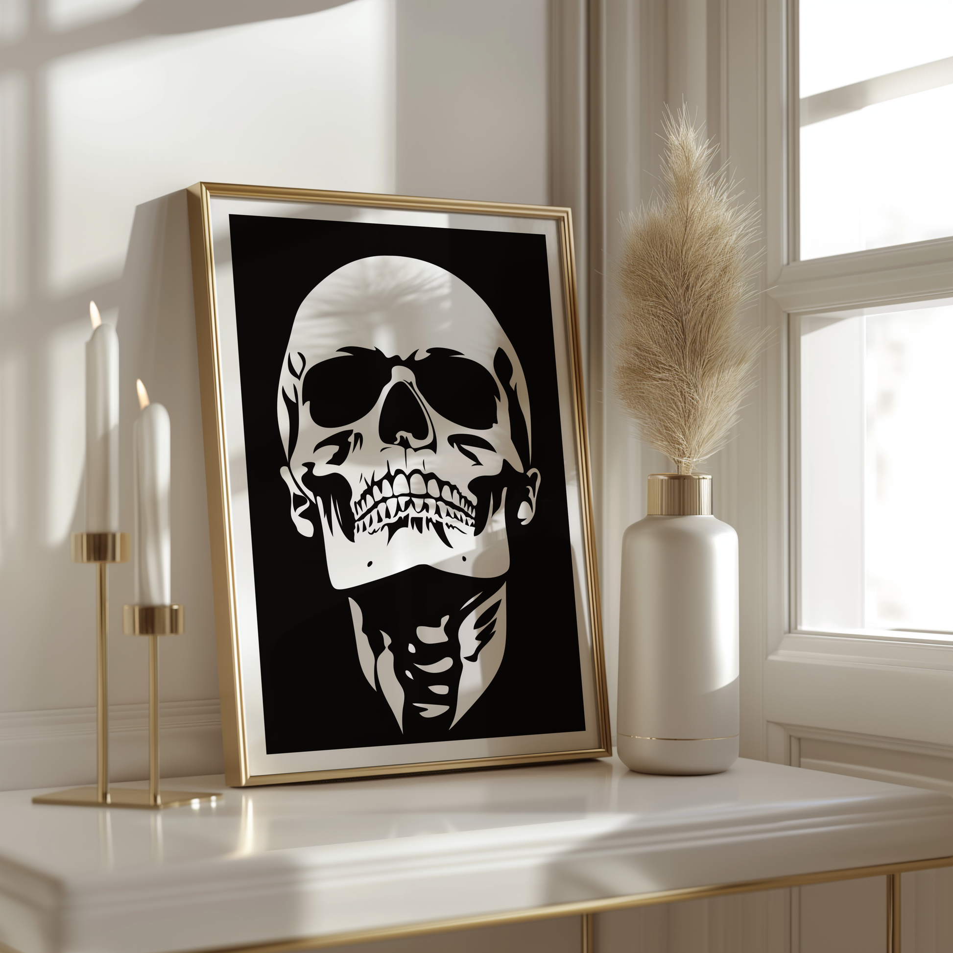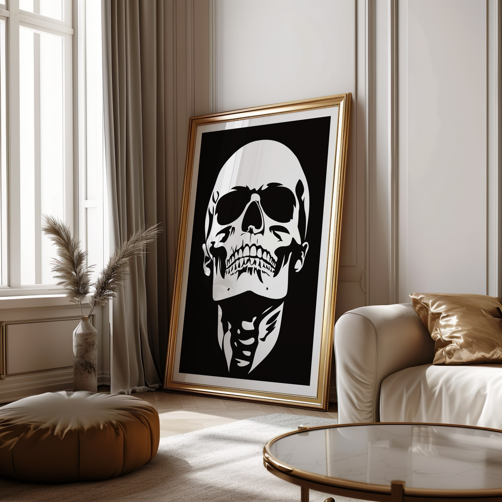 Add dramatic elegance to your space with this bold black-and-white skull print, perfect for modern interiors.